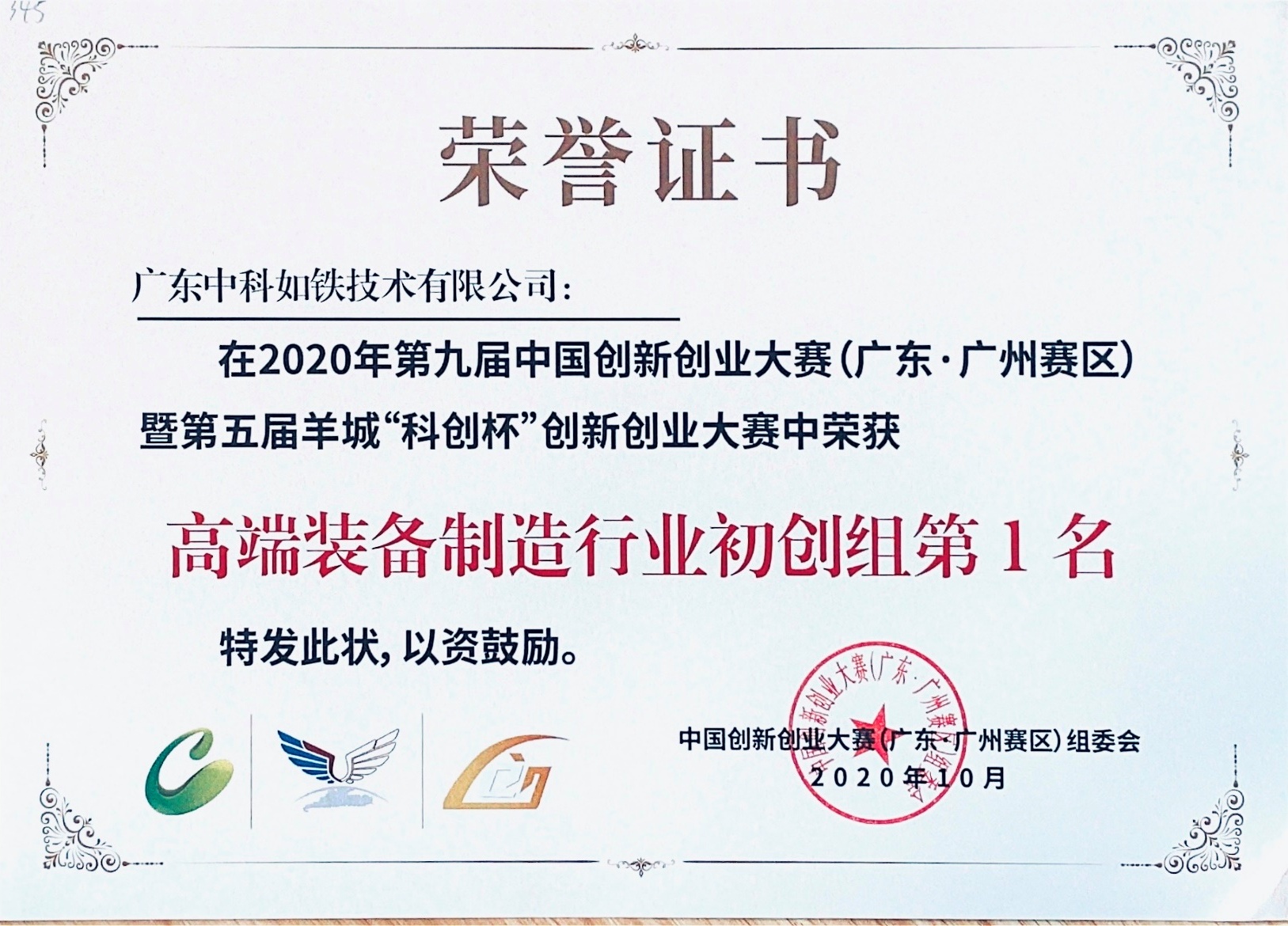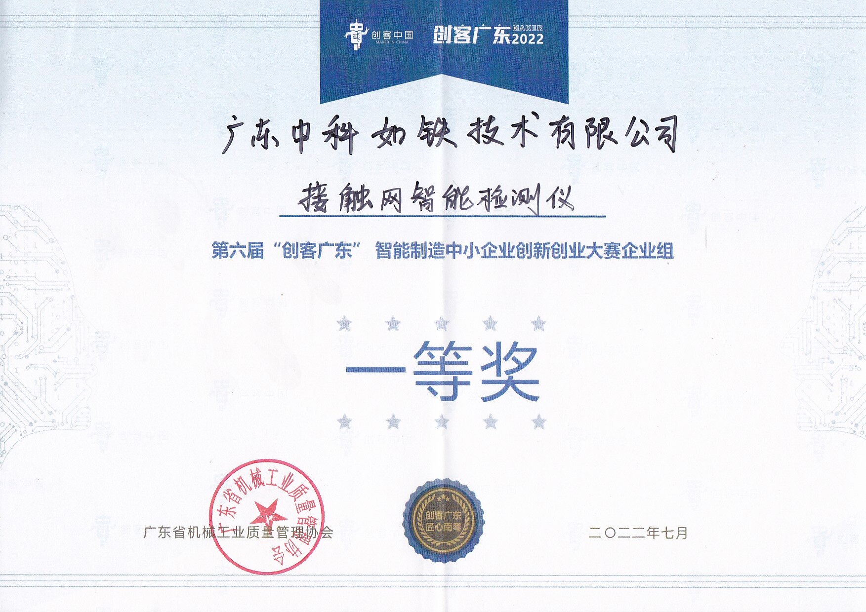 第六届“創客廣東”智慧製造中小企業創新創業大賽企業組一等獎